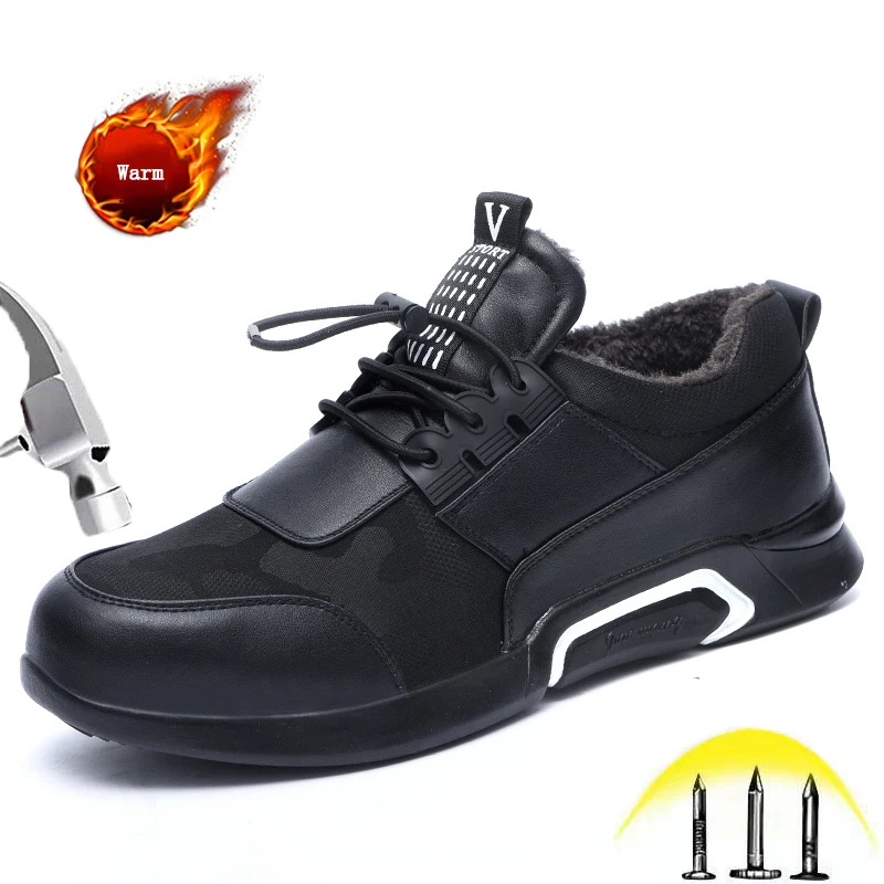 Mens Indestructible Steel toe Safety Shoes Winter Male Plush Warm Leather Casual Industrial Constru